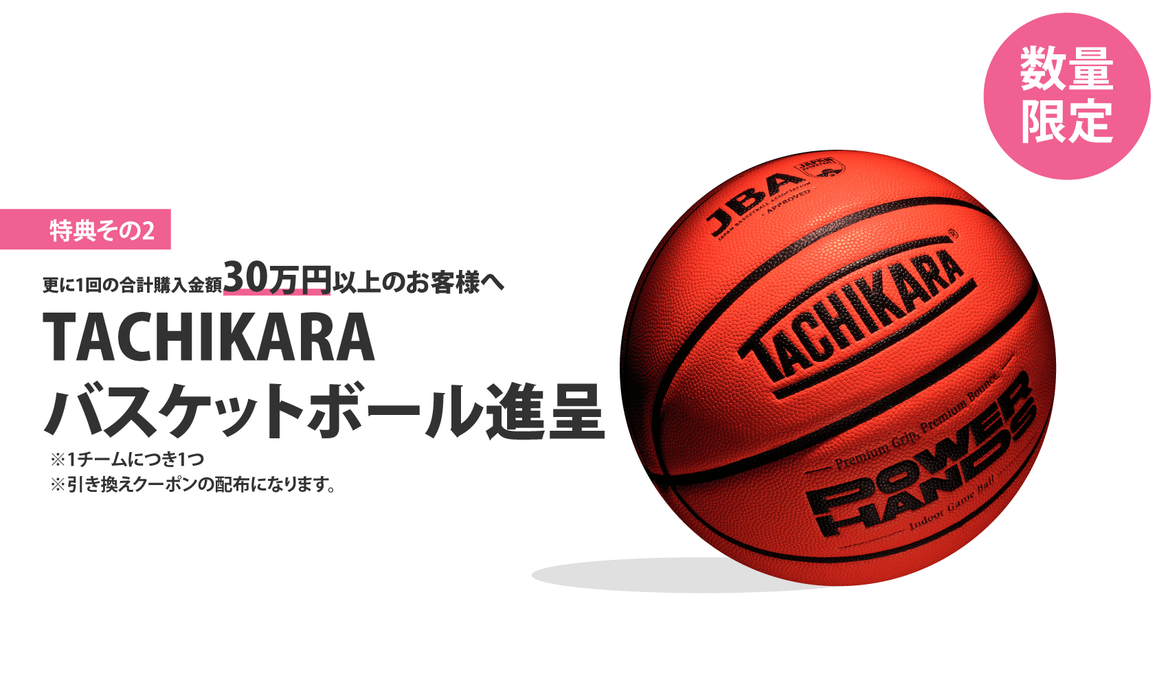 期間中の全商品合計金額が30万円以上のお客様には、さらにTACHIKARA(タチカラ)のバスケットボール進呈クーポンをプレゼントいたします。